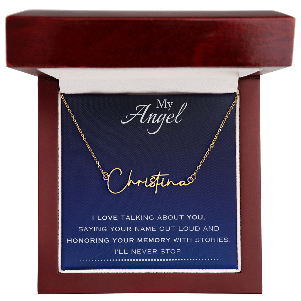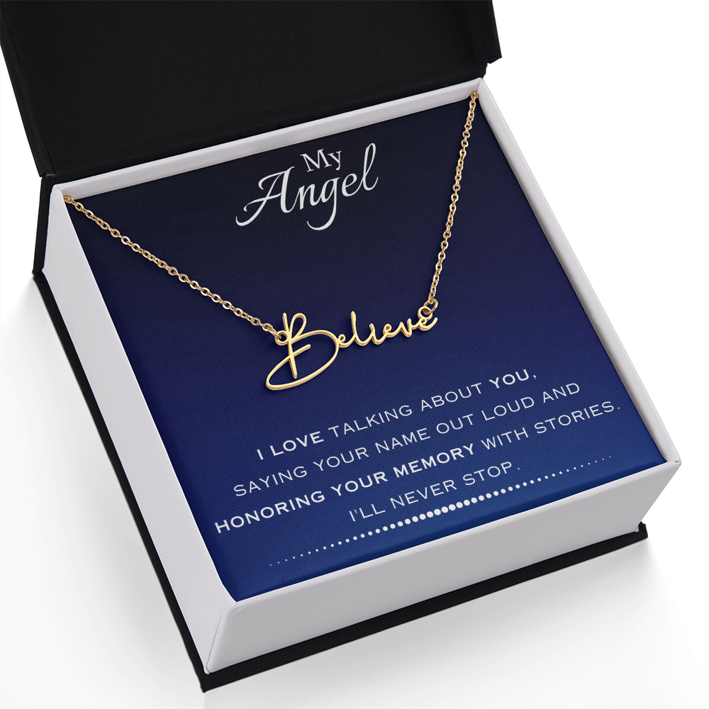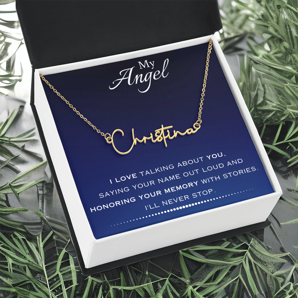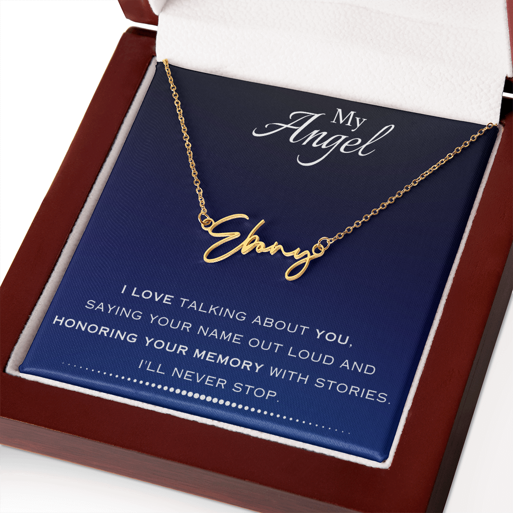 Looking to give your loved one a stylish and personalized gift that will melt their heart? Check out our AuroraBellucci™ Memorial Signature Style Name Necklace! This adorable custom necklace features a contemporary font that is sure to become a favorite accessory! From a heart-warming holiday present, special occasion gift, or just because, this unique necklace adds a trendy touch to any outfit